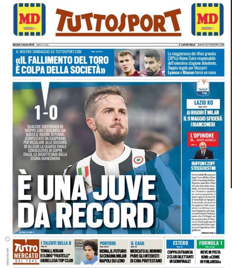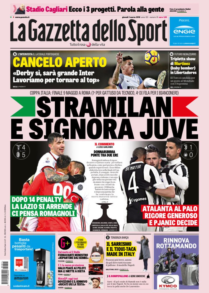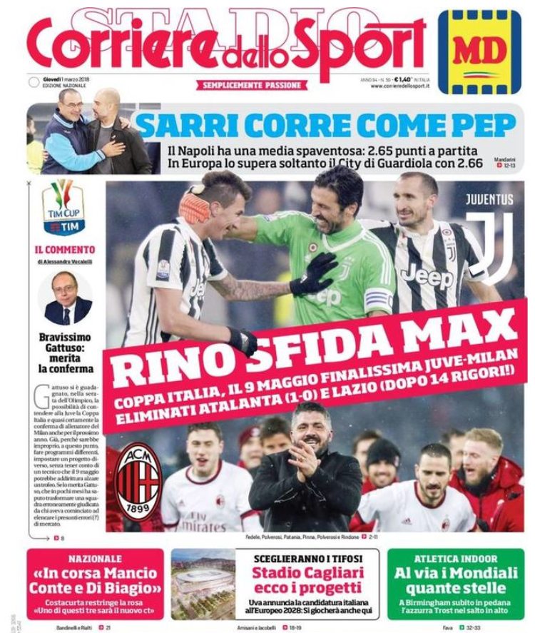 La Coppa Italia ha emesso i propri verdetti: la finale sarà fra Milan e Juventus. Monta la febbre per il derby di Milano, celebrato invece Sarri che tiene la media punti di Guardiola al Manchester City.
