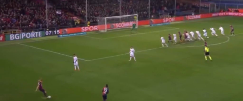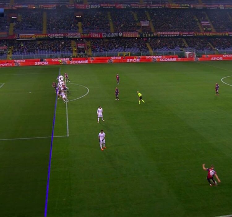 I rossoblu si dispongono su quell’angolo, in ordine, con Pandev sul primo palo, un mucchio a centro area con Zukanovic e Galabinov (che appare oltre la linea, ndr) che fanno da gabbia a Rigoni che si inserisce da dietro. Più lontano dall’azione Spolli.