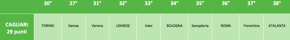 Cagliari 29 punti: la croce dei sardi? Sapere di avere la qualità di salvarsi, giocarsela con tutti e dopo arenarsi. Il Cagliari vincendo l’ultima a Benevento ha capito il pericolo corso, perdere avrebbe significato impantanarsi. Da recuperare la partita contro il Genoa il giorno 3 Aprile al Ferraris. In casa Torino, Udinese, Bologna, Roma Atalanta. Fuori: Hellas, Inter, Sampdoria, Fiorentina.