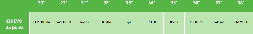 Chievo 25 punti: Era vecchio ed esperto ora è vecchio è stanco. Il tecnico Maran ci ha provato ad abbassare la carta d’identità in difesa, ancora peggiore è stato l’andamento dei clivensi. Passare dallo scorso campionato da gestire lungamente ad una faticosa ricerca di punti potrebbe incidere. L’età della rosa potrebbe essere un handicap ora che bisognerà sprintare. Recupero di Aprile con il Sassuolo. Poi casa Sampdoria, Torino, Inter, Crotone, Benevento. Fuori: Napoli, Spal , Roma, Bologna.