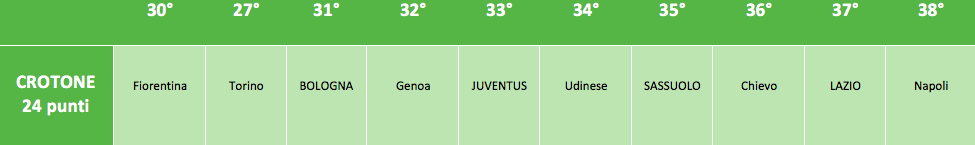 Crotone 24 punti: il grande difetto dei pitagorici? Essere passati dal Nicola l’Operaio al filosofo Zenga. Filosofia bizzarra che ha fatto punti con Inter, Atalanta e Samp e tonfi con Spal e Benevento. Con Nicola rincorrevano sempre il risultato contro chiunque con Zenga giocano solo contro le grandi. Zenga spera che la sua filosofia tenga avendo il calendario più difficile. Dopo la Roma giocata prima della sosta, se la dovranno vedere con Juventus, Lazio allo Scida e Napoli al S. Paolo. In casa ancora: Bologna , Sassuolo. Fuori: Genoa , Udinese, Chievo. Recupero di Aprile in casa del Torino.