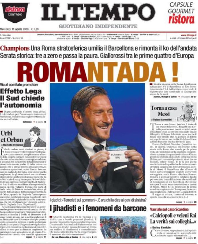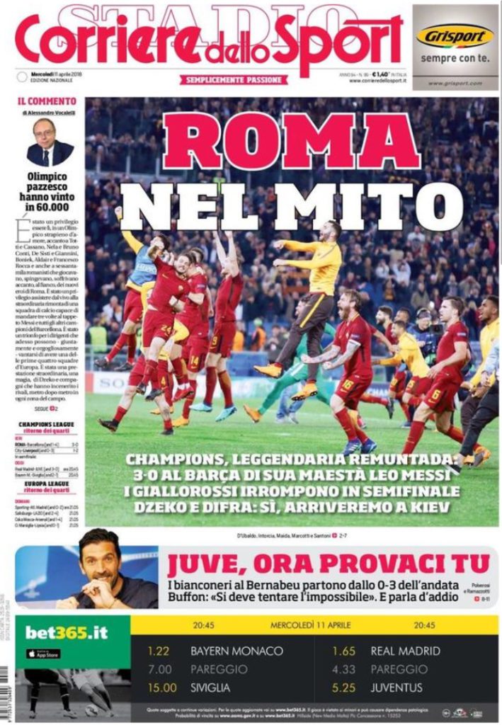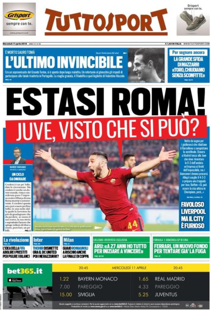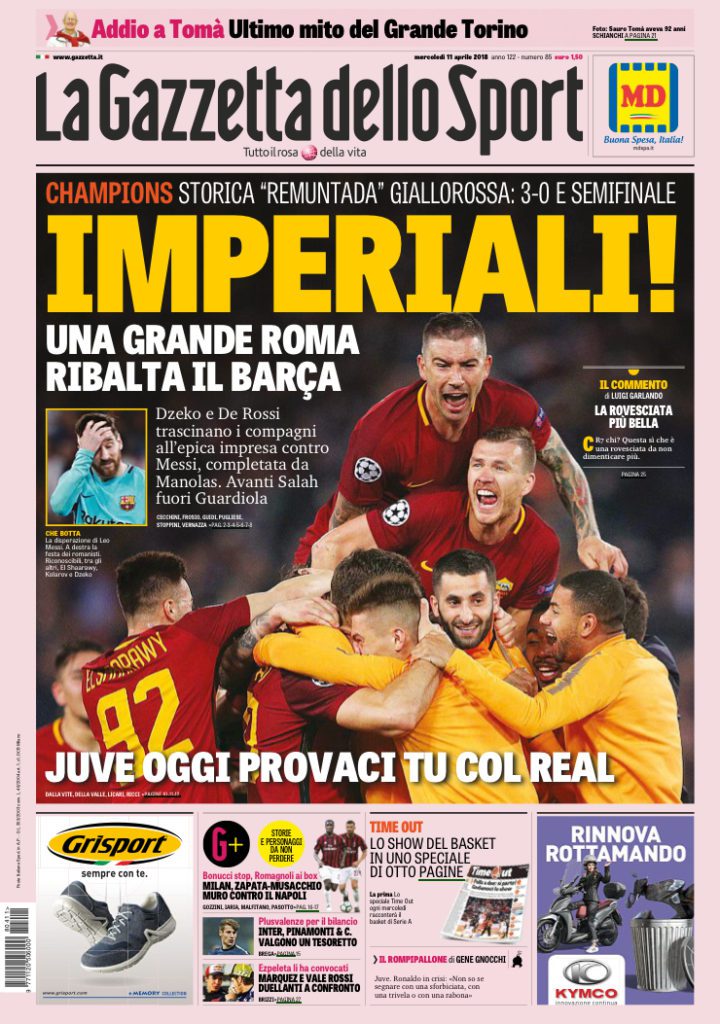 In Europa e in Italia è ovviamente tutta giallorossa la passerella sui quotidiani sportivi, con titoli che vanno dal “Romantada” de L’Èquipe alla “Caduta di Roma” del Mundo Deportivo. L’impresa della formazione guidata da Eusebio Di Francesco, entrato nella storia del club per aver conquistato la prima semifinale della storia in Champions, fa da sparring partner ad altre notizie come l’uscita del Manchester City contro il Liverpool, il ritorno della Juventus e, sul fronte Genoa, il ritorno di Mimmo Criscito messo nero su bianco: 5 anni di contratto e carriera chiusa in rossoblu.