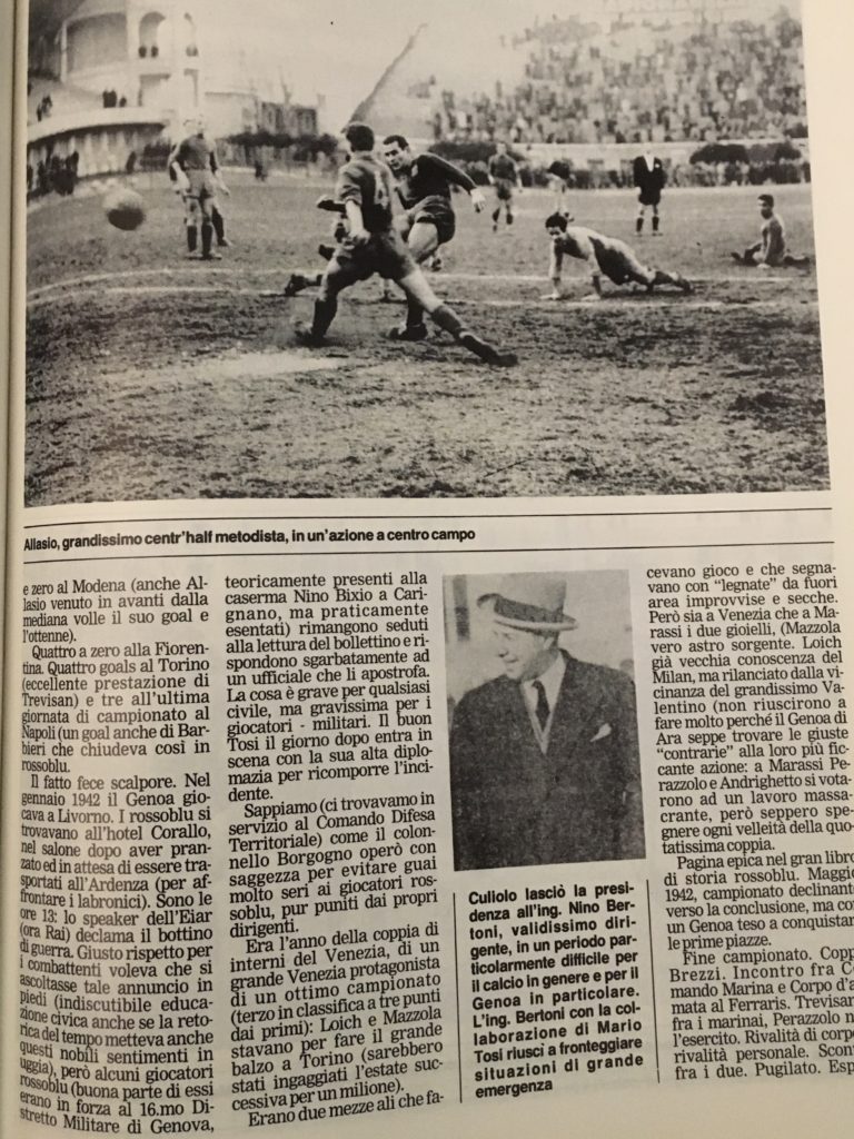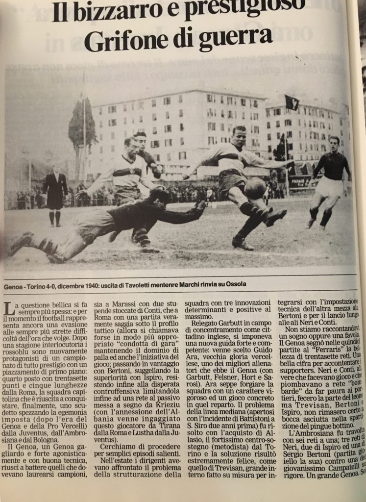 Si parla di un calcio fra evasione e realtà, fra partite giocate dopo i bombardamenti e confronti sportivi fra rappresentative militari italiane e tedesche, unici momenti in cui si poteva affondare un tacchetto nelle carni dei soldati tedeschi, come raccontano cronache del tempo. Il campionato lo vincerà il Torino, col Genoa che segnerà molto ma subirà tante reti e chiuderà quinto. “Un quinto posto dopo Torino, Livorno, Juventus e Ambrosiana non è da gettar via” spiegano Pesce, Bregante e Bozano in “Ciao Genoa, cent’anni di storia rossoblu”.