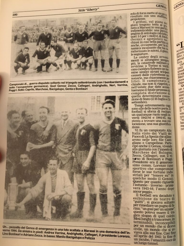 Gli Anni della Guerra in Italia costringono il mondo del pallone a trovare il modo di continuare a vivere, ma non certo con la vitalità degli anni precedenti. Una volta che il fronte di guerra si sposterà in territorio italiano, saranno molte le iniziative trasversali che sostituiranno il campionato, come il campionato “Alta Italia” vinto dai Vigili del Fuoco della Spezia prima che tutto si interrompesse sino al 25 aprile 1945, giorno della Liberazione. Per parafrasare “Genoa, dietro la facciata” di Amedeo Garibotti, “il calcio aveva chiuso bottega“.