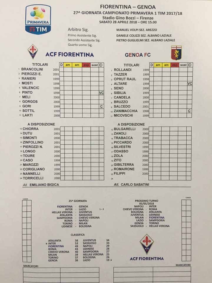 Al Due Strade di Firenze il Genoa gioca con la testa sgombra e passa in vantaggio al 28′ con un passante di Oprut, incontrollabile nel finire alle spalle di Brancolini. Gli strappi di Zanimacchia vengono frenati dalla difesa viola, che sbaglia tanto a centrocampo e vede sfumare le sfuriate di Sottil, i lampi di Gori e le chiusure tentate da Lakti, decisamente troppo irruento quando colpisce in pieno volto il portiere Rollandi a pochi passi da Volpi della sezione di Arezzo. Doppia occasione per la Fiorentina in chiusura di primo tempo, quando prima una chiusura provvidenziale di Seno e poi un tiro deviato in maniera sospetta fanno infuriare la panchina e gli spalti. Si chiede un fallo di mano, i toni vengono ritenuti eccessivamente elevati e proprio mister Biciga viene allontanato dal direttore di gara. Micovschi prova ad inventare, forte di una vivacità mai mancata durante la stagione, la Fiorentina si piace troppo e chiude il primo tempo in svantaggio.