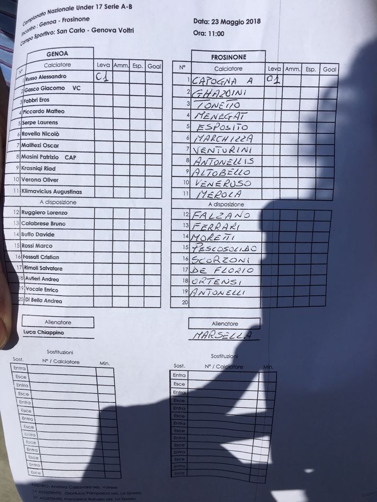 Il ritorno in territorio italiano dei rossoblu Russo e Rovella, reduci dal percorso trionfale all’Europeo Under 17 terminato con un secondo posto, è coinciso col primo turno playoff del campionato. Il Genoa di mister Chiappino se la vedeva al “San Carlo” di Voltri contro il Frosinone. Arbitrava Calzavara di Varese.