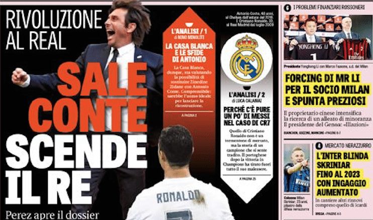 In prima pagina sulla Gazzetta dello Sport la chiamata del Real Madrid ad Antonio Conte: Florentino Perez, dopo aver sondato attentamente la pista che portava a Mauricio Pochettino, chiede l’italiano per guidare i Galacticos. Con o senza CR7?