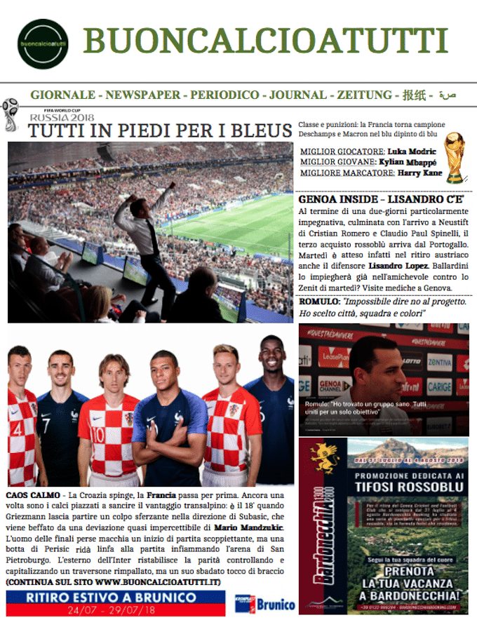 Giorno di festa per il calcio francese, giorno di gloria per il campionato italiano: arriva Cristiano Ronaldo. Mundo Deportivo non ha dubbi: i Bleus di Didier Deschamps hanno vinto il “Mondiale del VAR”. Le prime pagine francesi celebrano una vittoria storica a distanza di 20 anni dall’ultimo trionfo. Il giorno di gloria è arrivato!