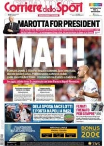 Tengono banco poi le tematiche di Federazione, col Corriere dello Sport che rilancia la candidatura di Beppe Marotta, che sarebbe sostenuto dai top club del calcio italiano. Occhi puntati anche sulla Serie B, che oggi saprà il suo destino di campionato a 19 oppure 22 squadre, e sul ritorno della Serie A, con la Gazzetta dello Sport che intervista il centrocampista bianconero Matuidi, fresco campione del Mondo.