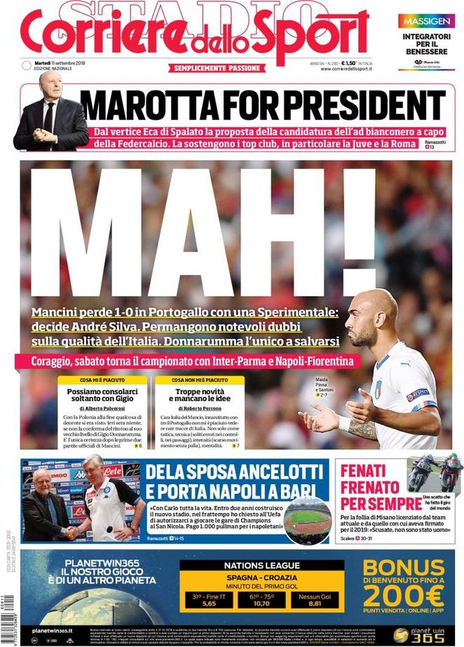 “Italia incubo infinito“, “l’Italia non s’è desta“, “Mah!“. Sono solamente tre dei titoli che affondano il coltello nella piaga della Nazionale Azzurra, sconfitta ieri sera dal Portogallo e scivolata all’ultimo posto nel girone di Nations League completato dalla Polonia. Agli azzurri vengono contestate non solo la mancanza di gioco, ma pure quella di idee. Si salva solamente Donnarumma.