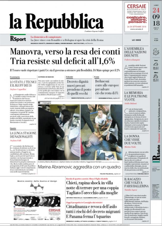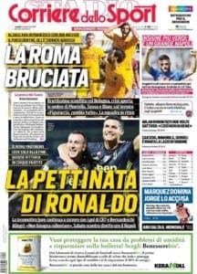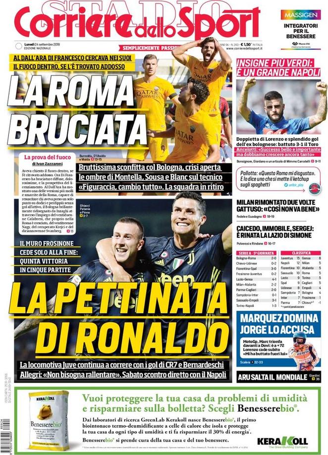Il successo per 2-0 della Juventus contro il Frosinone (che alla prossima casalinga affronterà il Genoa, ndr) lascia spazio a titoloni di ogni sorta sulle prime pagine dei quotidiani sportivi. Juventus definita “implacabile”, Ronaldo colui che ha stappato definitivamente la formazione bianconera. Note di demerito per il Milan, che diventato Higuain-dipendente perde tre punti all’ultimo secondo contro l’Atalanta, e per la Roma, che parte in ritiro punitivo prima di affrontare il Frosinone. Non in secondo piano il successo esterno del Napoli a Torino contro i granata: Insigne diventa il “profeta” di questa formazione. Risalgono la classifica Udinese e Lazio.