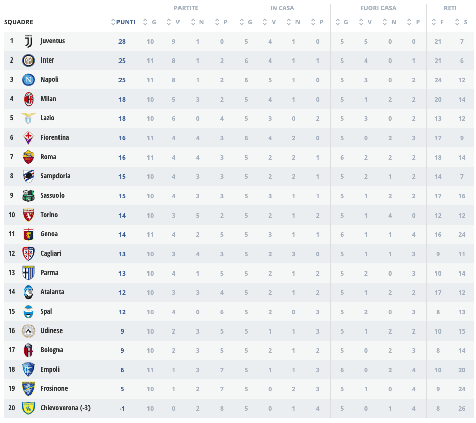 LA CLASSIFICA DOPO FIORENTINA-ROMA