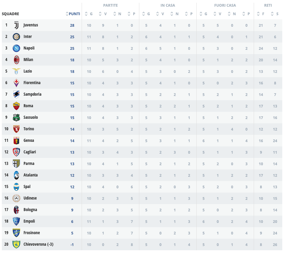 Alle ore 15 il calcio d’inizio del primo anticipo del sabato di Serie A, apertosi con il 5-1 rifilato dal Napoli all’Empoli. Sabato che proseguirà con Fiorentina-Roma e Juventus-Cagliari, rispettivamente alle ore 10 e 20:30. L’Inter torna a San Siro nelle vesti dell’unica squadra italiana ad aver mantenuto una media di 3 punti a partita in campionato nel mese di ottobre; dopo la sconfitta contro il Parma, i nerazzurri sono usciti vincenti da tutte e 6 le sfide successive (Sampdoria, Fiorentina, Cagliari, SPAL, Milan, Lazio). Seguono Palermo, Pisa e Juve Stabia con una media di 2.5 punti a partita nel mese di ottobre.