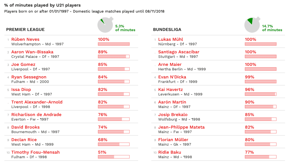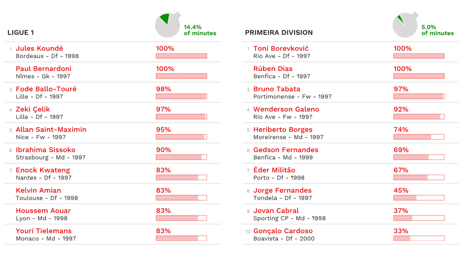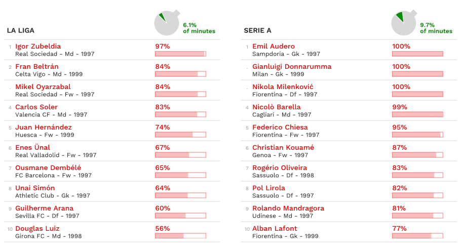 Spicca un dato: solamente undici giocatori sotto la soglia dei ventun’anni hanno giocato tutte le partite senza mai essere sostituiti. Tre in Serie A (Milenkovic, Audero, Donnarumma) e tre in Bundesliga. Due in Ligue 1 e Primeira Division portoghese. Uno solo in Premier League. Nessuno nella Liga spagnola.