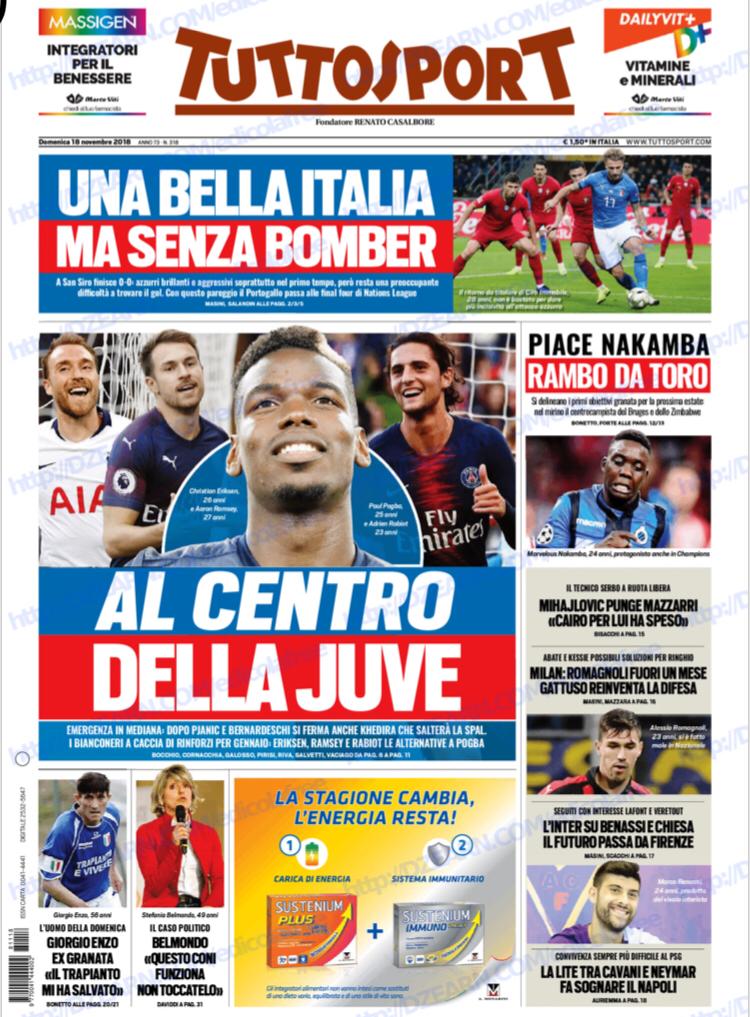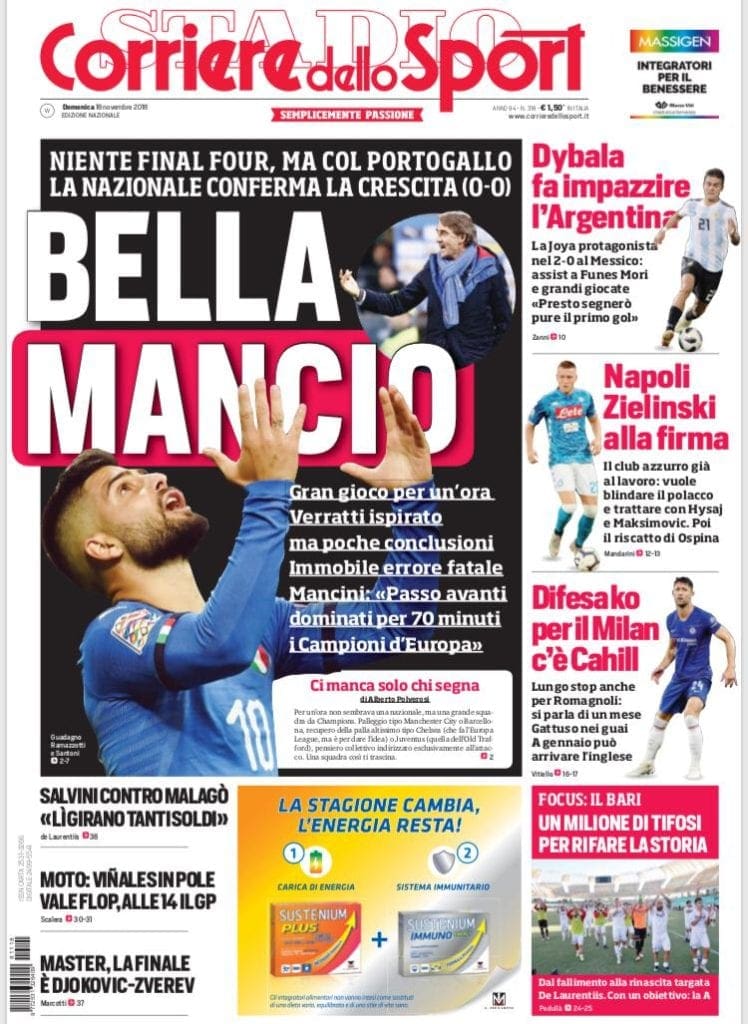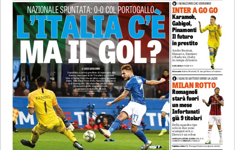 Tutte le prime pagine lodano la prestazione dell’Italia contro il Portogallo nell’ultima sfida di UEFA Nations League, un pareggio che lascia gli Azzurri al secondo posto. Appena fuori dalle final-four, quanto basta per evitare la retrocessione e conquistare ancora più fiducia. Mancini: “Primo tempo dominato”.