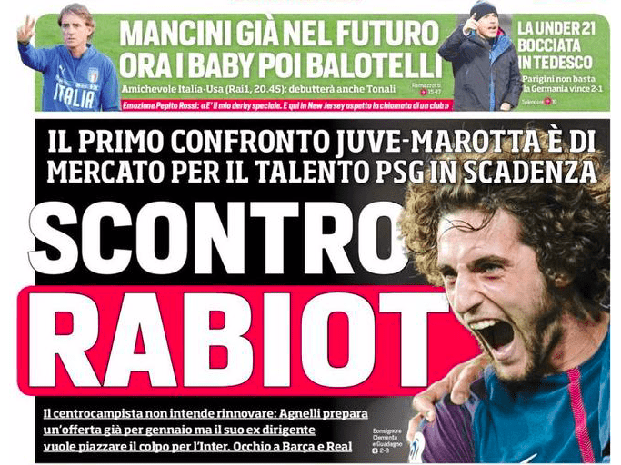 Le prime pagine odierne variano molto. C’è chi accenna all’amichevole della Nazionale questa sera a Genk contro gli Stati Uniti, gara che potrebbe vedere Mancini sperimentare, e c’è chi parla di Ibrahimovic verso il Milan. La Gazzetta dello Sport intervista Thiago Motta, il Corriere dello Sport rilancia il duello di mercato Inter-Juventus per Rabiot e intervista Giuseppe Rossi, ancora in cerca di una squadra. Mino Raiola intanto tesse le fila dei rapporti con la Juventus per Kean, Pogba e De Liga.