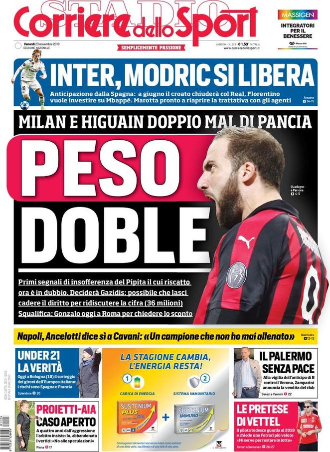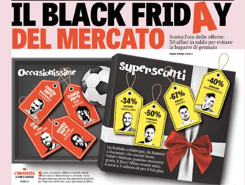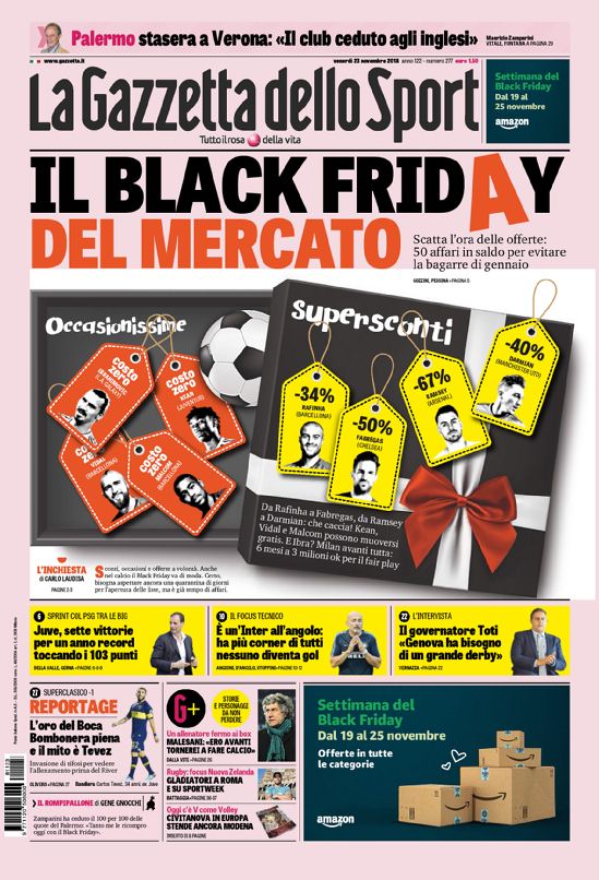 Il Black Friday dello shopping si apre con la prima pagina della Gazzetta, che ricorda come anche in tempo di calciomercato invernale gli sconti siano all’ordine del giorno. Se Ancelotti sarebbe pronto ad accogliere a Napoli Edinson Cavani, il Milan potrebbe lasciar tornare a Torino Gonzalo Higuain senza esercitare alcun diritto di riscatto. Ruben Neves, De Gea e James Rodriguez: sono questi i nomi portati sul piatto da Mendes per la prossima estate juventina? Chelsea su Skriniar, Inter ancora una volta attenta alle vicende che legano Modric al Real Madrid fino al termine della stagione.