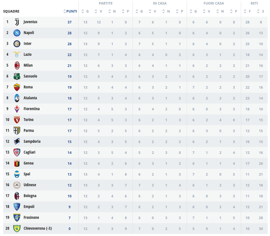 LA CLASSIFICA DOPO IL TERZO ANTICIPO DEL 13° TURNO DI SERIE A