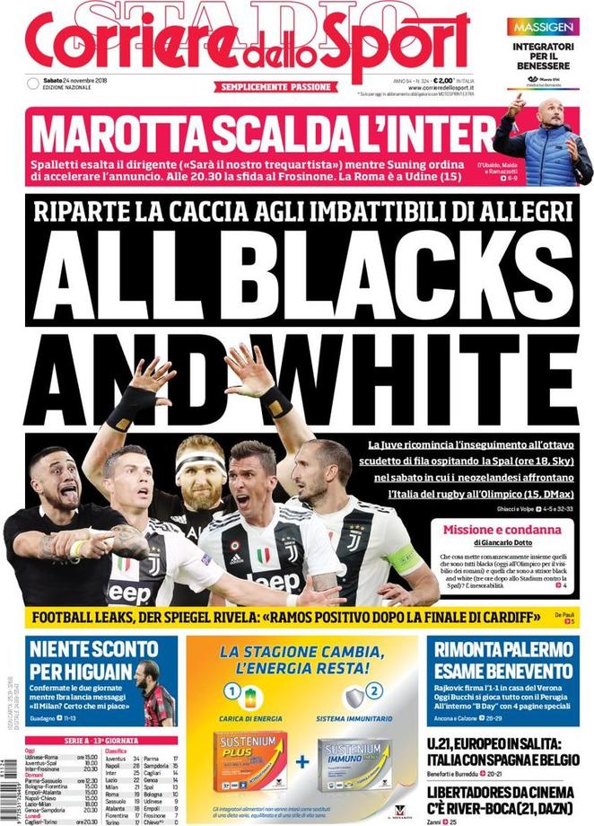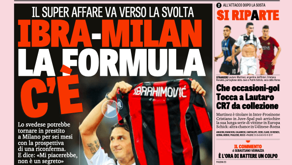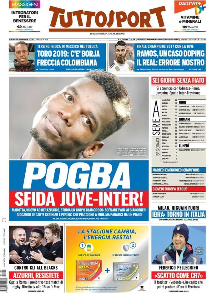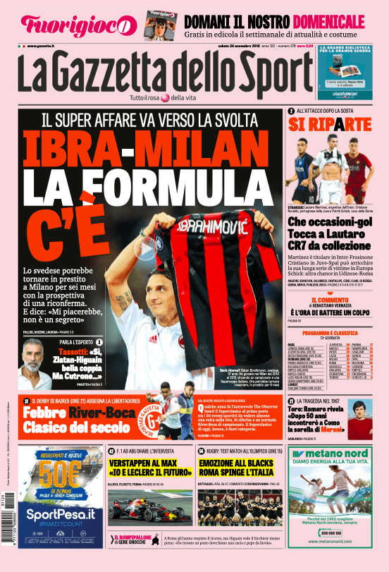 Oltre alla conferma della squalifica per due giornate ad Higuain e alla Serie A che ricomincia questo pomeriggio con Juventus-Spal, le prime pagine odierne sviluppano soprattutto le tematiche di calciomercato. Ibrahimovic continua a strizzare l’occhio al Milan, Pogba conteso fra Juventus e Inter, dove è corteggiato da Marotta. Qualche richiamo in taglio basso anche per la finale di ritorno della Copa Libertadores fra River Plate e Bpca Juniors (ore 21 diretta su DAZN).