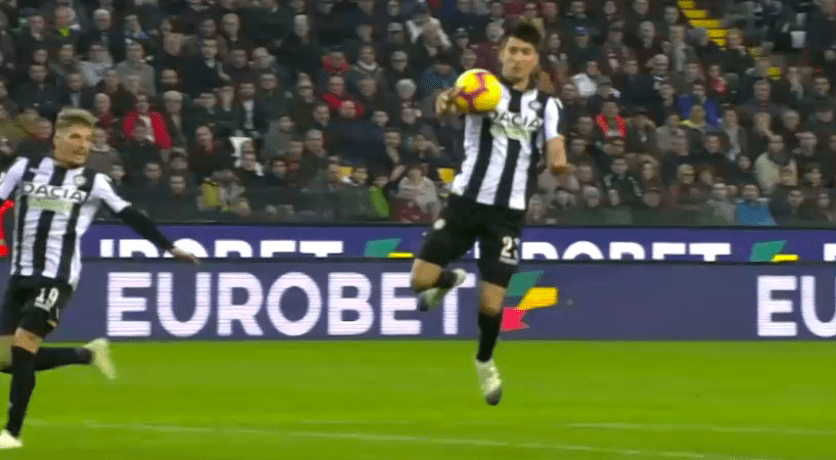 UDINESE-ROMA – Al 63esimo di gioco la formazione friulana, già in vantaggio grazie alla rete di De Paul (54′), raddoppia con Pussetto che stoppa il pallone col petto e insacca alle spalle di Olsen. Fabbri convalida la rete, senza rendersi conto (è distante almeno 15 metri dalla zona dove si materializza l’episodio) che l’attaccante dell’Udinese si porta avanti il pallone col braccio destro. Lo richiama Guida (VAR) affinché revisioni l’accaduto, cosa che accadrà e che porterà il direttore di gara ad annullare la rete del 2-0. Non ci sarà però ammonizione per Nacho Pussetto.