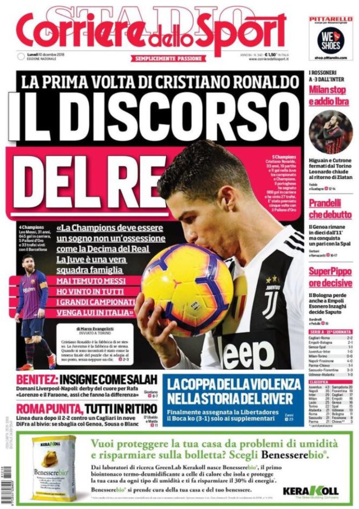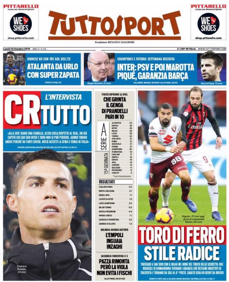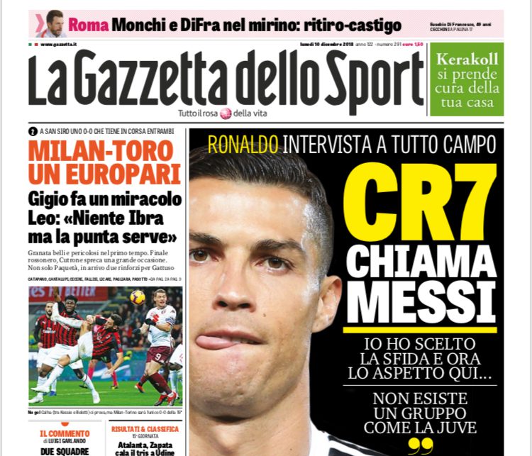La prima intervista di Cristiano Ronaldo alla carta stampata, che compare su tutte le prime pagine dei maggiori quotidiani sportivi nazionali, si prende largo spazio e fa annunciare a CR7 come nessun club sia come la Juventus e come non tema Messi.