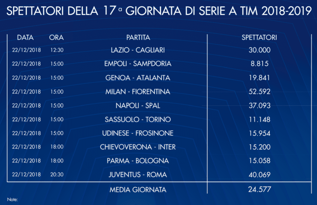 Ad ogni modo, che negli stadi non sia stata una giornata da tutto esaurito lo dicono i numeri. Numeri che ci raccontano come nel giorno del Boxing Day si sia registrata una media spettatori complessiva di 25.405 persone. Si tratta della settima giornata di campionato su diciannove per affluenza negli stadi italiani, ma cadendo nel giorno del più contenuto tra gli spezzatini televisivi, è da considerarsi l’ennesima occasione perduta.