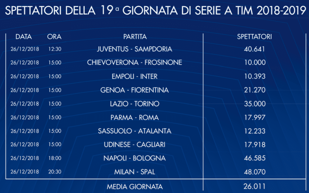 Il perché la Serie A non possa e non debba sorridere è sotto gli occhi di tutti. Gli stadi italiani, pur con intere famiglie a casa, non hanno attratto così tanto. Hanno vinto il senso di famiglia e, forse pure un po’ controvoglia, la visione della partita in televisione. Vorremmo raccontarvi anche i numeri degli ascolti televisivi, quantomeno dirvi se fosse stato replicato lo share dell’anno passato oppure avesse prevalso il menefreghismo. Tuttavia da questa stagione, senza esattamente conoscerne il motivo, la Lega Serie A non produce più questi dati di giornata in giornata.