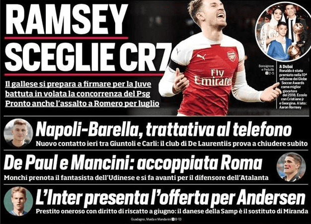 Calciomercato: Ramsey ha scelto la Juventus, che sia a giugno o a gennaio, il Napoli prova a vincere la corsa per Barella, su cui sono presenti tutte le grandi del nostro campionato. C’è anche l’Inter, che punta Andersen e vede il Milan tentare il colpo Ferreira Carrasco nonostante il largo ingaggio percepito dall’esterno belga. De Paul e Mancini sulla lista di Monchi, il Torino pensa a Roberto Pereyra del Watford per alzare il livello a centrocampo.