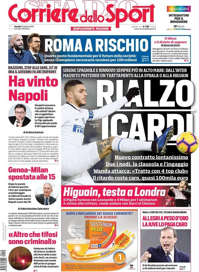 Non se la passano bene Inter e Milan, che nelle ultime 48 ore hanno incassato le voci di alcuni malumori da parte di Icardi e Higuain, i due centravanti argentini che in estate potrebbero lasciare Milano. Monchi traccia il futuro della Roma, spiegando che senza quarto posto bisognerà pianificare cessioni per cento milioni di euro. Il sindacato di Polizia attacca dopo gli scontri di Roma, durante la festa per i 119 anni della Lazio. Il Napoli vira su Barella dopo che il PSG avrebbe messo sul piatto 100 milioni per arrivare ad Allan.