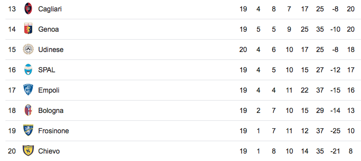GENOA INSIDE – In virtù dei risultati odierni, il Grifone resta al 14° posto a due lunghezze di distanza proprio dai friulani. Domani si comincia con Frosinone-Atalanta alle ore 12.30, si prosegue con SPAL-Bologna, Fiorentina-Sampdoria e Cagliari-Empoli prima del posticipo fra i partenopei e la Lazio.