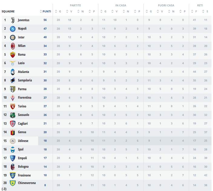 Il secondo tempo si apre con un doppio miracolo di Sorrentino: prima vola sullo stacco imperioso di Douglas Costa, poi para un calcio di rigore a Cristiano Ronaldo, assegnato per un fallo di mano commesso da Bani su un tiro di Douglas Costa. Prima del triplice fischio, ci sarà tempo anche per l’hat-trick bianconero con Daniele Rugani, che da solo stacca di testa in mezzo all’area. Massimiliano Allegri risponde così al Napoli portandosi a 9 punti di distacco proprio dai partenopei, secondi a quota 47 punti. Di seguito la classifica aggiornata: