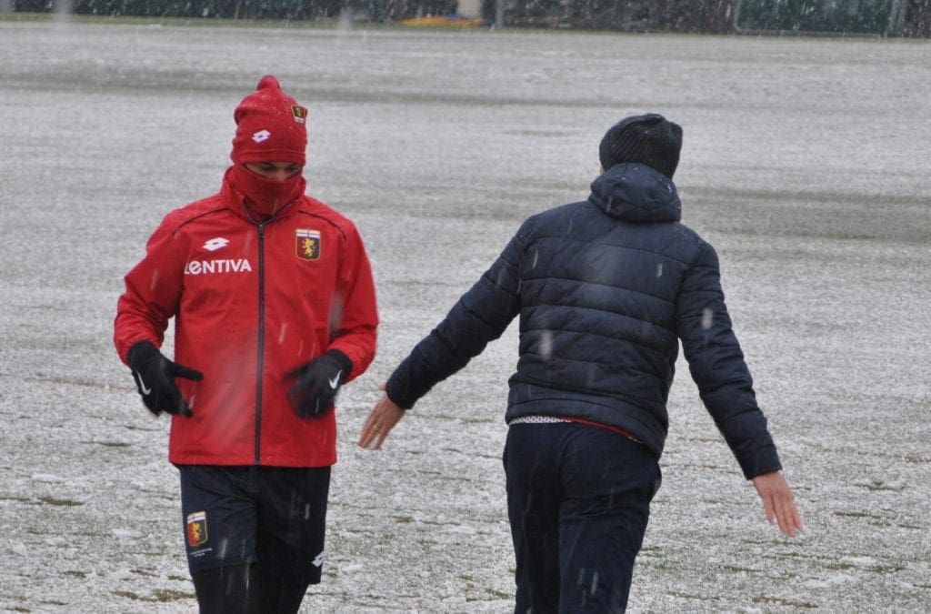 Quattro persone sugli spalti, tre addetti ai lavori e un solo, impavido tifoso. Tutti con l’ombrello in mano per ripararsi dalla nevicata che incombeva su Genova e che aveva imbiancato il terreno di gioco e gli spalti del “Signorini”. Un grado percepito e la sensazione, poi smentita dai fatti, che il primo allenamento della settimana non si sarebbe svolto sul terreno di gioco del “Signorini” investito con delicatezza dai fiocchi di neve.