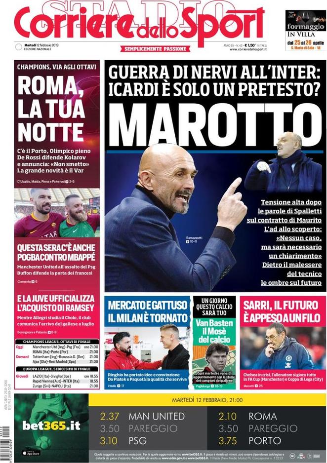 La Gazzetta dello Sport intervista Fabio Paratici nel giorno in cui Aaron Ramsey conferma di aver firmato un pre-contratto con la Juventus. Il Milan è stato rigenerato dagli acquisti di Piatek e Paquetà, la Roma si gioca gran parte del proprio futuro nella prima degli Ottavi di Champions contro il porto (questa sera alle ore 21) e il Toro si gode il solito Sirigu, aiutato da Berenguer a parare il rigore ad Okaka. Sarri appeso a un filo: decisivi i risultati in FA Cup, Coppa di Lega ed Europa League nelle prossime due settimane. Il Secolo XIX apre in prima pagina con lo scandalo Spezia, di cui vi abbiamo riportato le vicende extra-calcistiche già nella giornata di ieri (CLICCA QUI)