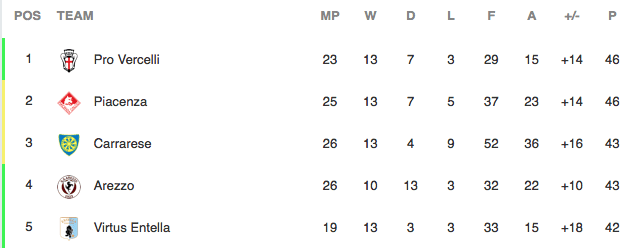 Ora ci siamo. La Virtus Entella, nonostante un inizio di stagione travagliato e ritardato dai continui responsi e ricorsi al TAR, si sta imponendo a mani basse e a pieno titolo come la squadra più competitiva del Girone A. I capoclassifica della Pro Vercelli, sconfitti al Comunale di Chiavari, vedono avvicinarsi pericolosamente i biancocelesti di mister Boscaglia, cui vanno grandi meriti per aver saputo fare di necessità virtù nel momento del bisogno, dimostrando allo stesso tempo abilità e predisposizione nel far integrare i nuovi innesti rendendoli fin da subito elementi su cui fare affidamento. Dall’esperto Mancosu alla coppia formata da Giosa e Iocolano, rispettivamente spalla di Pellizer al centro della difesa e trequartista alle spalle degli attaccanti.
