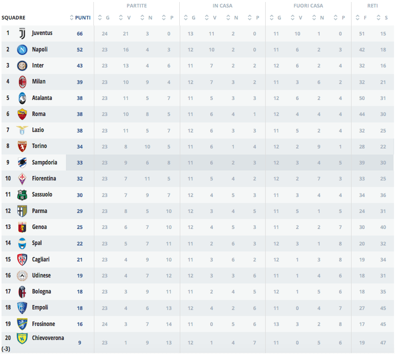 66 – La Juventus, in attesa del posticipo domenicale tra Napoli e Torino, allunga a 14 i punti di vantaggio sui partenopei raggiungendo quota 66 lunghezze. 21esima vittoria in 24 partite per i ragazzi di Allegri.