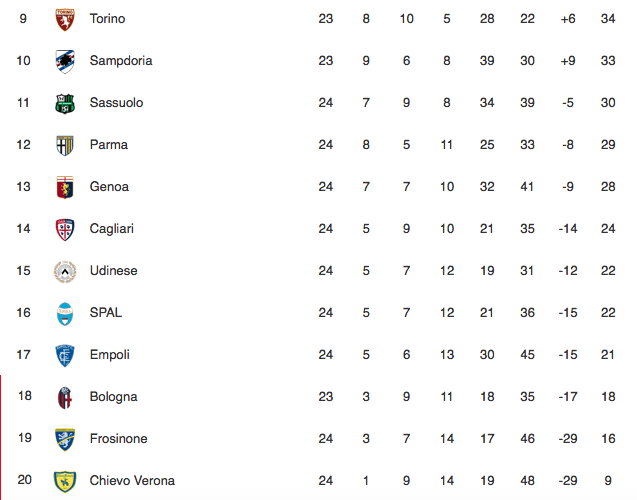 ALLE ORE 15 – Oltre al 2-1 del Genoa sulla Lazio (clicca qui) al Ferraris, è una vittoria di spessore anche quella conquistata dall’Empoli contro un Sassuolo colpito dalle reti di Krunic, Acquah e l’ultimo arrivato Farias, L’Udinese passa sul Chievo grazie ad un calcio di rigore, decretato con l’ausilio del VAR e trasformato da Lukasz Teodorczyk. In attesa della sfida tra Inter e Sampdoria (ore 18), questa la classifica aggiornata.