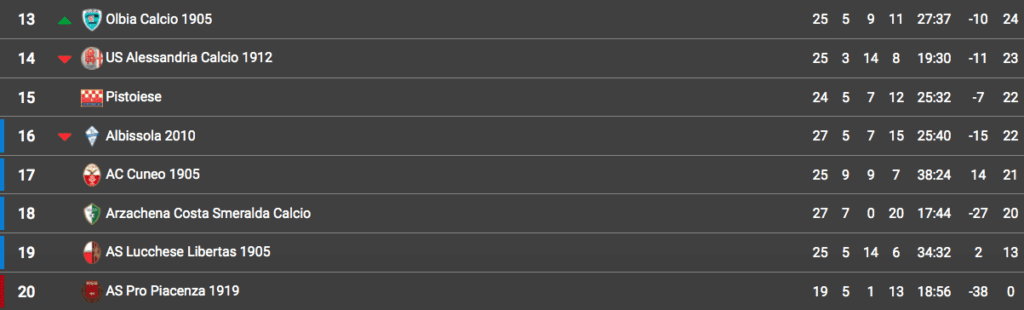 COME CAMBIA LA CLASSIFICA – A fronte delle penalizzazioni dell’esclusione dal campionato del Pro Piacenza, a subire un grande mutamento è la graduatoria del Girone A. Se la Lucchese si trova ad annaspare a quota 13 punti in classifica, con un passivo di -16, anche il Cuneo è stato ricacciato nei bassifondi della classifica e ha subìto una penalizzazione di 15 punti totali. Le quattro società in oggetto erano state deferite “per non aver sostituito, entro il termine perentorio del 17 gennaio 2019, la garanzia rilasciata in sede di ammissione al Campionato di Serie C 2018/2019 con una garanzia in possesso dei requisiti previsti dal C.U. F.I.G.C. 50 del 24 maggio 2018, con l’applicazione della recidiva”.