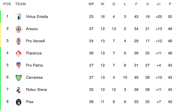 Dopo aver conquistato la vetta del Girone A di Serie C a fronte dell’esclusione della Pro Piacenza, la Virtus Entella tornava in campo al Comunale di Chiavari alla ricerca di una vittoria per consolidare il primato e mettersi a debita distanza dalle dirette concorrenti. Per farlo c’è da superare l’ostacolo Piacenza, lontano pochi punti e reduce da sette risultati utili consecutivi, forse con qualche pareggio di troppo per poter ambire al primo posto.