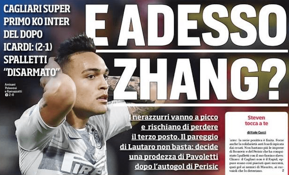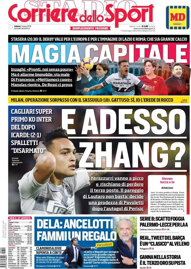 Milan e Roma possono tentare rispettivamente il sorpasso e l’aggancio all’Inter, sconfitta alla Sardegna Arena nella serata che ha sancito “la fine della positività”. Marotta pensa al colpo Allegri, la Juve ripensa ad Antonio Conte, questa sera un superderby all’Olimpico. Gli scontri fra poliziotti ed ultras dell’Atalanta, di ritorno dalla trasferta al Franchi di Firenze, diventa un caso ed il presidente Percassi chiede chiarezza al vice-premier Salvini.