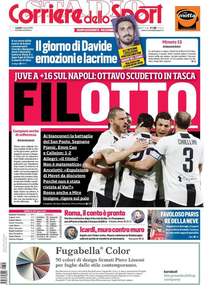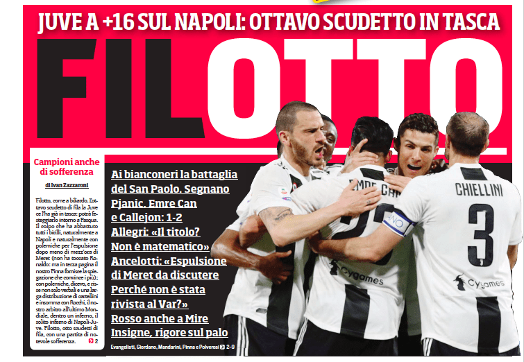 La Juventus mette le mani sull’ottavo Scudetto consecutivo con 12 giornate d’anticipo. A 16 punti dal secondo posto, ora la vittoria sembra una semplice formalità. Polemiche per il rosso a Meret, decisione che ha inevitabilmente cambiato la partita. Il futuro di Di Francesco si decide dopo Porto-Roma, quello di Mauro Icardi resta in stallo anche dopo la fine delle terapie per la pulizia del ginocchio. Il Torino si candida per un posto in Europa League, l’Atalanta non si è mai tirata indietro e lo dimostra battendo la Fiorentina nella seconda sfida contro i viola nel giro di tre giorni. Il ricordo per Davide Astori, a un anno dalla sua tragica scomparsa, è presente nella maggior parte delle prime pagine.