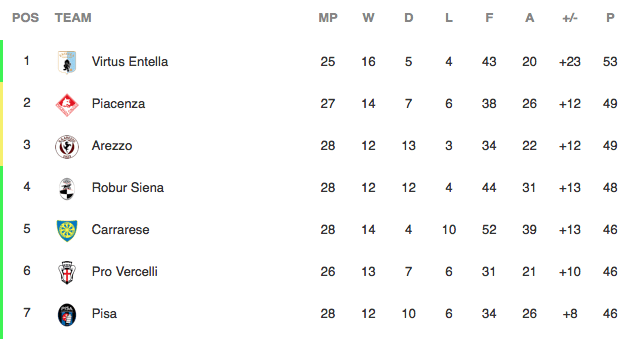 In classifica non cambia nulla: i punti rimangono 53, con Piacenza e Arezzo alle calcagna. “Sconfitta in un campo difficile che ci sta vista la partita, con una squadra forte che in casa ha fatto bene: in tanti hanno perso qua. Al primo tiro in porta abbiamo subito gol, da lì poi diventa difficile giocare con loro perché non ti fanno manovrare. […] Dobbiamo subito voltare pagina e pensare al Pontedera” queste, in sintesi, le dichiarazioni di mister Roberto Boscaglia a fine gara, ai microfoni ufficiali del club ligure. La squadra ha ancora due occasioni, due gare da recuperare per aumentare il divario in testa alla classifica. Ora i punti di vantaggio sulla seconda sono quattro, ma potrebbero diventare una decina.