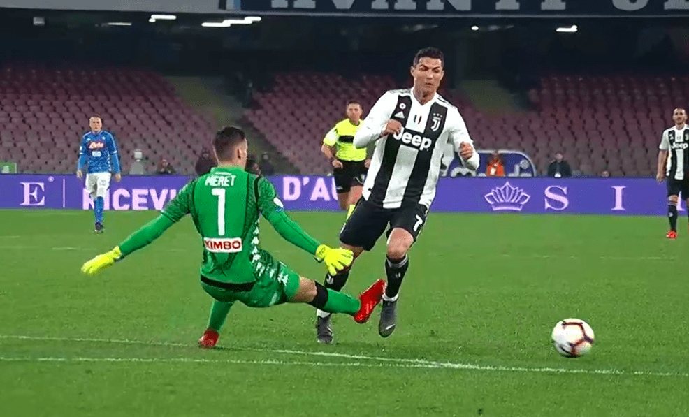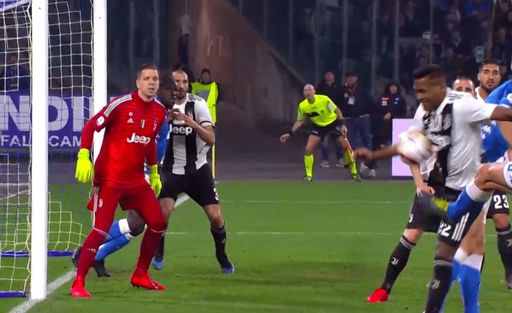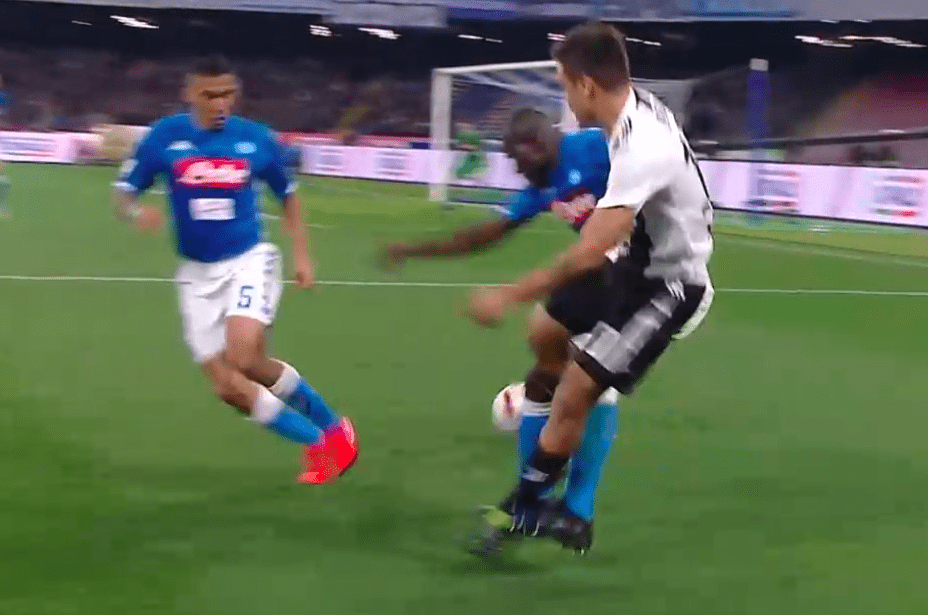 NAPOLI-JUVENTUSNella foto, l’uscita di Meret su Ronaldo considerata fallosa dall’arbitro Rocchi, assistito al VAR da Irrati, e valevole del cartellino rosso essendo una chiara occasione da gol. Pur mancando un’immagine frontale dell’azione, quelle che passano in televisione raccontano che se un contatto c’è, è talmente leggero da non poter sbilanciare CR7. E sempre che ci sia, dovrebbe essere tra la gamba sinistra di Meret e la caviglia di Ronaldo. Intervento comunque negligente di Meret che ha la gamba alta, CR7 salta per evitare un impatto violento. La moviola su questo episodio non finirà mai: ci si dividerà sempre tra il tentare di colpire e il colpire effettivamente l’avversario. Si è preservata la verità di campo.Nella foto, il tocco di braccio di Alex Sandro (poi ammonito) in area di rigore. Per Rocchi non c’è nulla a velocità di gioco, ma le proteste dei giocatori del Napoli sono ben più che un indizio sulla punibilità del gesto. Effettivamente il braccio è largo, perfettamente punibile rispetto ad altri interventi avvenuti negli ultimi mesi di campionato, e Rocchi infatti tornerà sui propri passi rapidamente dopo il suggerimento di una on field review da parte di Irrati. Il rigore che ne scaturisce sarà sbagliato da InsigneNella foto, il fallo di Koulibaly su Dybala a pochi minuti dalla fine. A rivederlo, è falloso e meriterebbe il giallo, il secondo per il difensore del Napoli, che verrebbe quindi espulso. Il VAR in questi casi è intervenuto a singhiozzo, in molti casi preservando la decisione presa in campo dall’arbitro. Al “San Paolo” il copione è stato il medesimo: graziato il difensore partenopeo