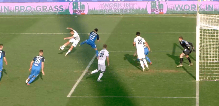EMPOLI-PARMANella foto, il gol di Bruno Alves prima annullato dall’arbitro Di Bello, poi convalidato dal VAR Maresca. Questione di millimetri, ma il capitano crociato è tenuto in gioco da Dell’Orco. Il tiro precedente era stato di Kucka.