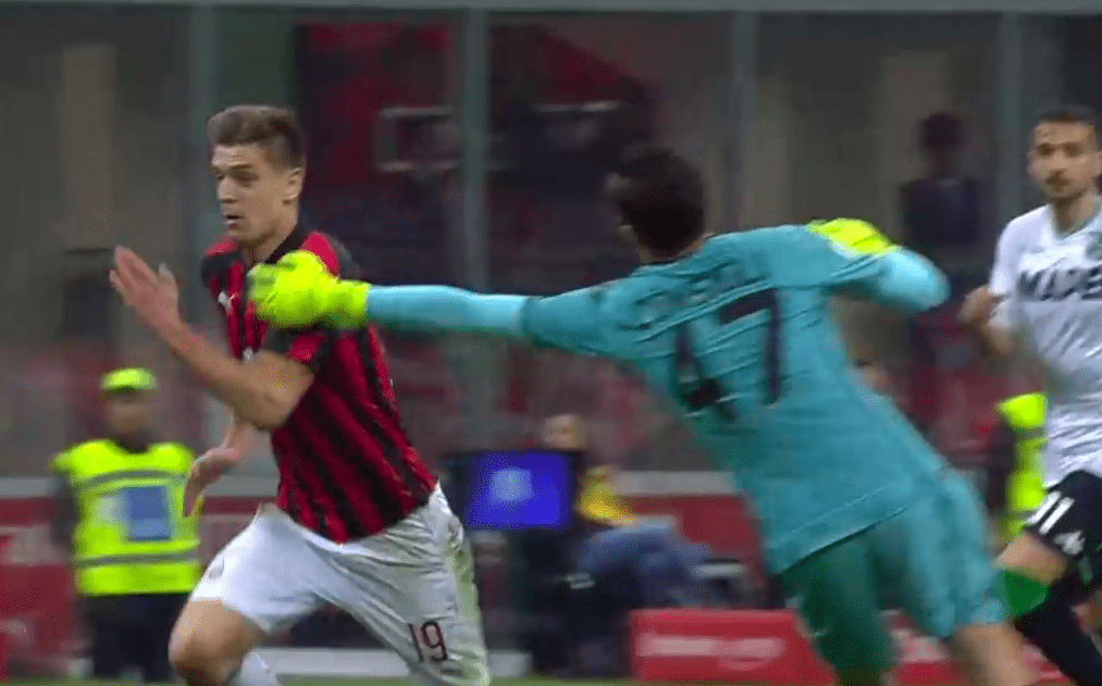 MILAN-SASSUOLONella foto, il leggero contatto Consigli-Piatek. Siamo nell’alveo della decisione presa alla Dacia Arena per il fallo di Poli su Pussetto, con la sola variante che a “San Siro”, dove arbitrava Valeri, il VAR Fabbri richiede e consiglia una on field review: o per valutare l’entità del fallo o per comminare una sanzione minore (giallo e non rosso) al portiere del Sassuolo. Fatto sta che Valeri rivedrà l’episodio al minischermo senza però smentire la sua decisione. Consigli riceve il rosso diretto: come per Cassata, salterà però solamente un turno di campionato…