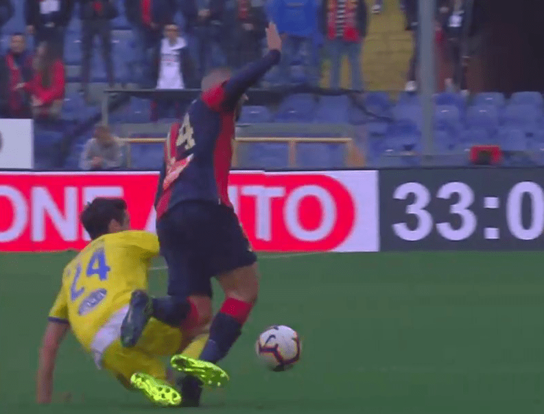 GENOA-FROSINONENella foto, la parte finale del contrasto Cassata-Biraschi. Non ci sarà il piede a martello, ma per chi era presente l’intensità del contrasto era sicuramente almeno da giallo. L’arbitro Mariani non ha nessun dubbio nel fermare il gioco, estraendo un rosso diretto che ha fatto storcere il naso a parte dei moviolisti. Serve un precedente in cui non si è ritornati sui propri passi, da rosso a giallo? Criscito su Schiattarella in Genoa-Spal. A dimostrazione che la scelta in campo possa essere stata un po’ mal commisurata ci si è messo, anche questa settimana, il Giudice Sportivo: Cassata infatti ha ricevuto una sola giornata di squalifica anziché due. Smentito il referto di Mariani, la cui decisione era stata confermata dal VAR Nasca