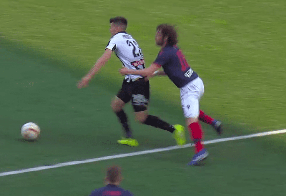 UDINESE-BOLOGNANella foto, il contatto fra Poli e Pussetto che varrà il rigore a favore dei friulani. Al VAR c’è Pairetto ad assistere Massa, che giudica la mano sinistra del centrocampista felsineo come sufficiente a propiziare la caduta in area del numero 23 friulano. In realtà, il contatto è veramente modesto: in stagione il VAR difficilmente è intervenuto su valutazioni che non siano chiari ed evidenti errori e qui la vera ingenuità è di Poli. Episodio che condiziona la gara della Dacia Arena, a sul quale è inutile appellarsi alla tecnologia. Diverso sarebbe stato se Pussetto avesse platealmente simulato senza un vero e proprio contatto.