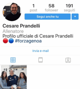 Dopo essere rimasto attivo, assieme ad altri profili ancora attivi, per diversi mesi, ma senza pubblicare nulla, il profilo falso che fa riferimento a Cesare Prandelli è tornato oggi a pubblicare la fotografia che ritrae il tecnico con le due calciatrici del Genoa femminile, Giada Abate e Arianna Giupponi. Una fotografia presa dal sito ufficiale e pubblicata da un profilo Instagram che non è gestito da Prandelli. La società ha evidenziato la presenza di questo profilo fake e invita a segnalarlo affinché venga chiuso. Non si tratta peraltro del primo tentativo, debitamente segnalato, di creazione di una pagina fittizia a nome dell’attuale allenatore del Genoa.