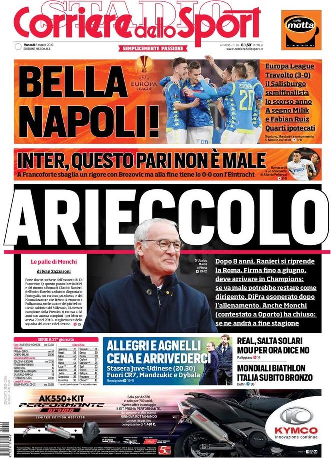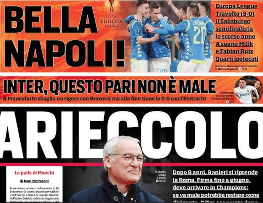 Il Napoli travolge il Salisburgo, l’Inter fa 0-0 a Francoforte ma perde Lautaro Martinez e Kwadwo Asamoah per la gara di ritorno. Icardi tornerà ad allenarsi nel giorno della festa della donna? A Roma Di Francesco paga per tutti ed anche Monchi si prepara all’addio. Sulla panchina giallorossa torna Claudio Ranieri, salutato con un romanesco “arieccolo” dal Corriere dello Sport in prima pagina. La Juventus si prepara al grande turnover in vista della gara decisiva contro l’Atletico Madrid; questa sera affronta l’Udinese senza Cristiano Ronaldo, Mandzukic e Dybala. Allegri ed Agnelli ieri a cena per discutere del futuro.