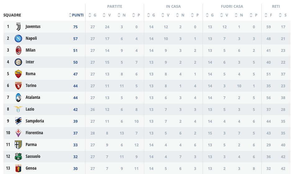 Stefano Pioli, che ultimamente fa parlare di sé più per questioni di rinnovo che non di risultati, vede la sua Fiorentina ferma a 37 punti, addirittura 7 punti lontano dal settimo posto occupato dall’Atalanta, che però ha la possibilità di rilanciare il distacco a dieci punti sfidando il Chievo. Domani grande occasione per la Sampdoria, di stanza a Sassuolo, per allungare di cinque punti sulla formazione viola. Il Cagliari, dal canto suo, sale a quota 30 punti e aggancia il Genoa.