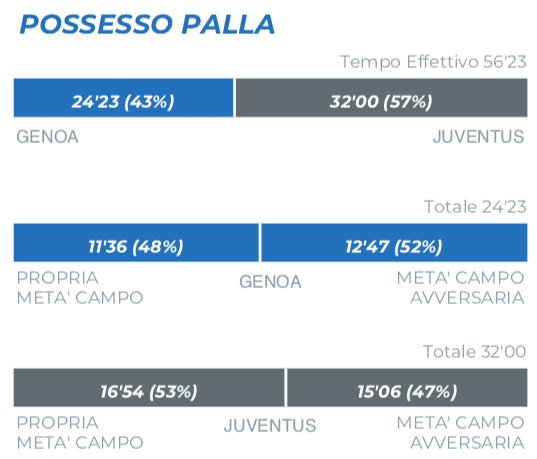 La partita è stata piacevole, più per la garra del Genoa che non per le invenzioni dei bianconeri, e lo dimostra anche il fatto che si sia giocato molto più di tante altre gare. Il tempo effettivo si aggira infatti intorno ai 57′, col possesso pallone sbilanciato a